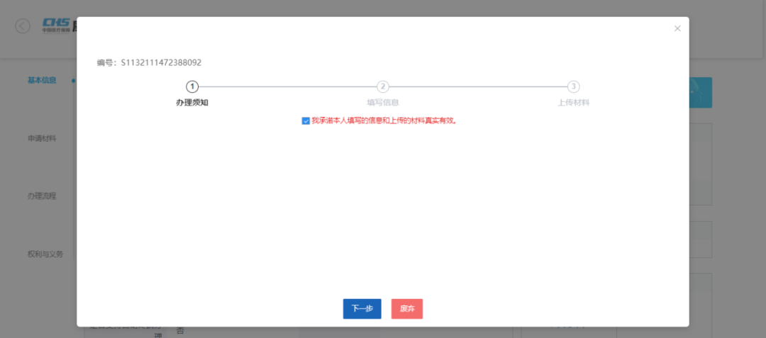 5.办理须知处点击下方“我承诺本人填写的信息和上传的材料真实性”,之后点击下一步。