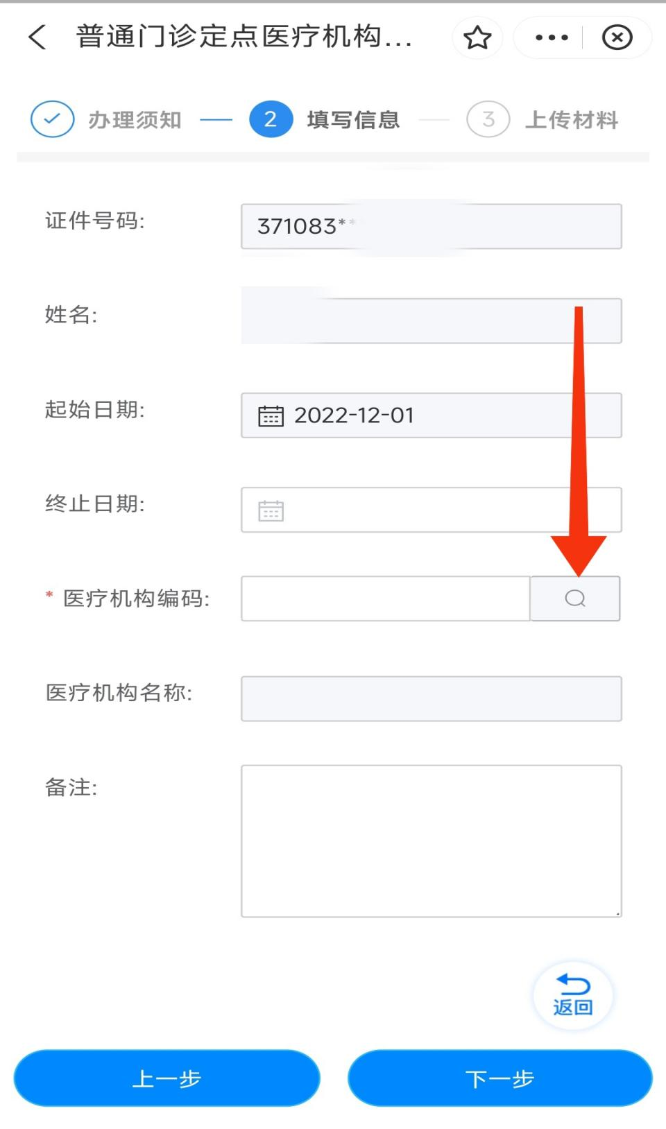 5.认 真填写信息,根据实际情况填写定点医疗机构和终止日期(终止日期可以为空,长期有效),其中医疗机构编码和名称可以通过点击功能按钮进行选择,确认完成后点击下一步
