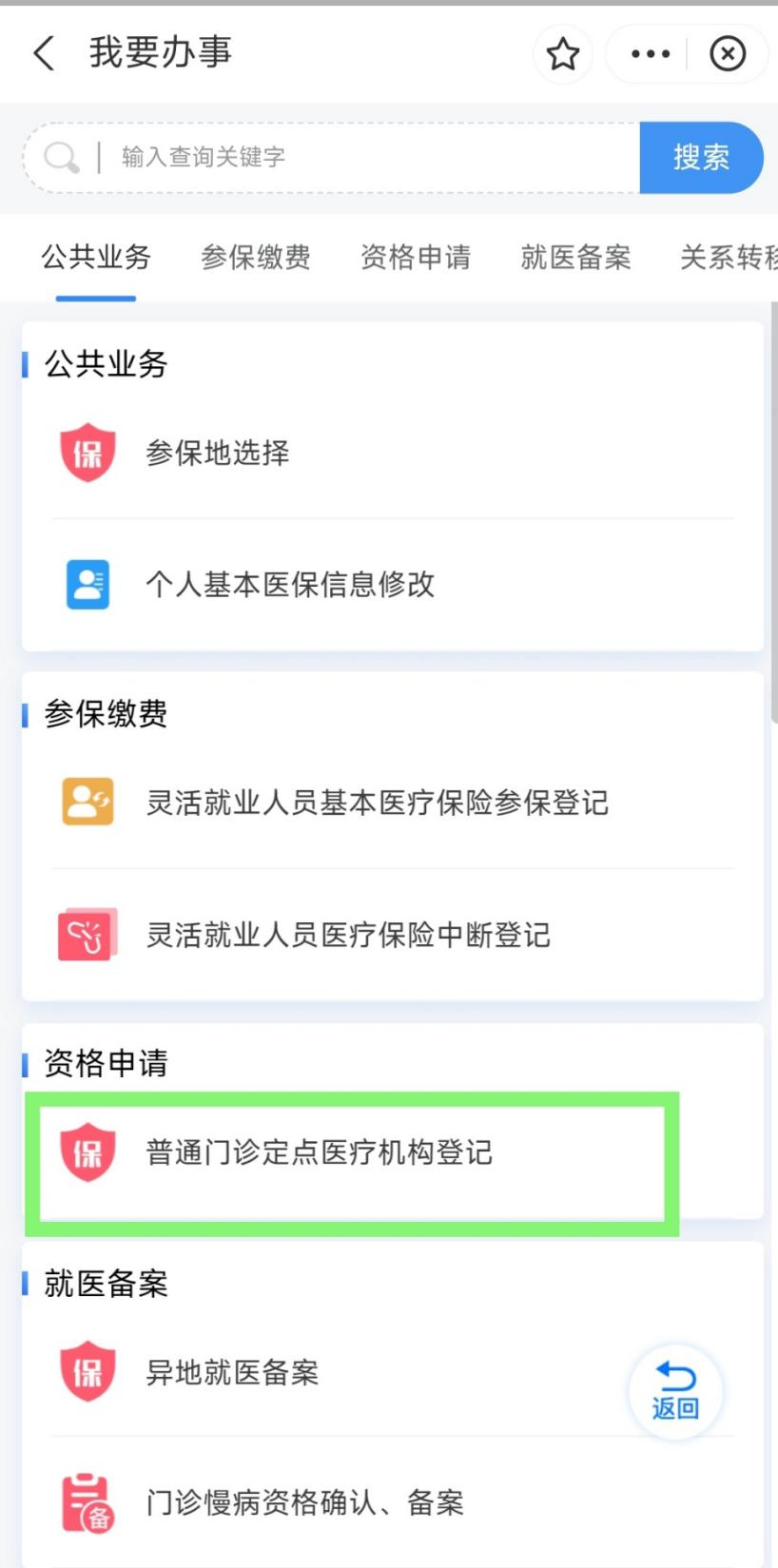 3.在“资格申请”模块,选择“普通门诊定点医疗机构登记”进行个人信息备案。