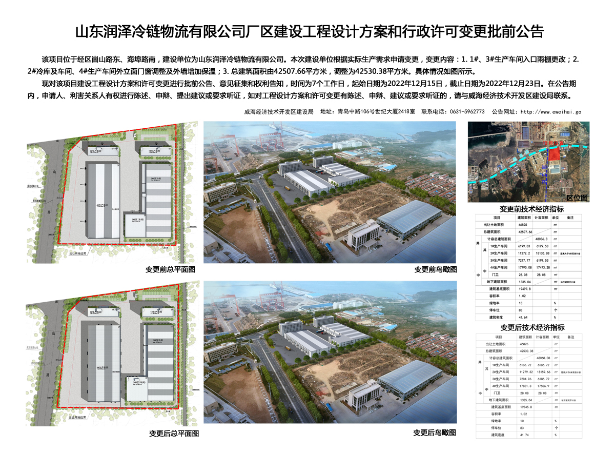 山东润泽冷链物流有限公司厂区建设工程设计方案和行政许可变更批前公告