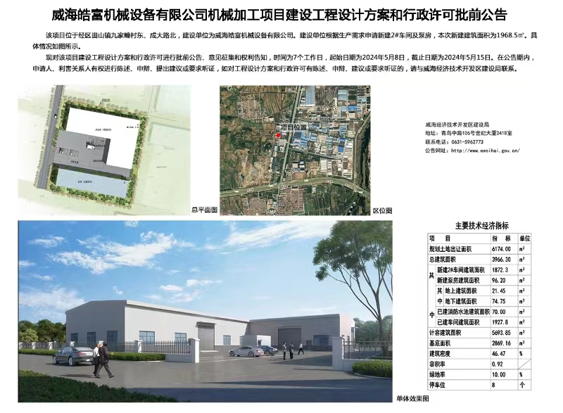 威海皓富机械设备有限公司机械加工项目建设工程设计方案和行政许可批前公告