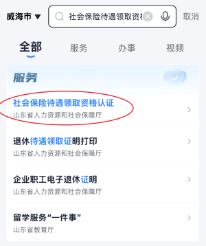 在“爱山东”手机APP首页搜索“社会保险待遇领取资格认证”,点击进入。