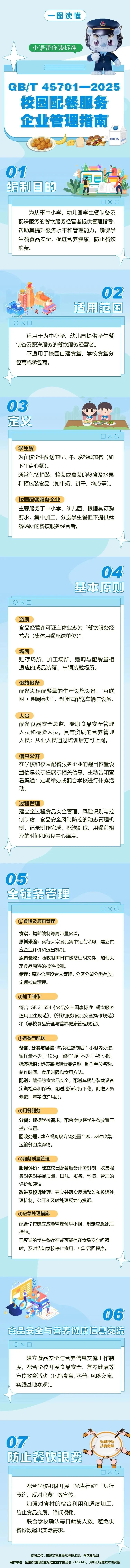 2025年7月,市场监管总局批准发布《校园配餐服务企业管理指南》国家标准。该标准将于2025年12月1日正式实施,适用于为中小学、幼儿园学生提供学生餐制作及配送服务的校园配餐服务企业,是校园配餐服务管理首个国家标准。