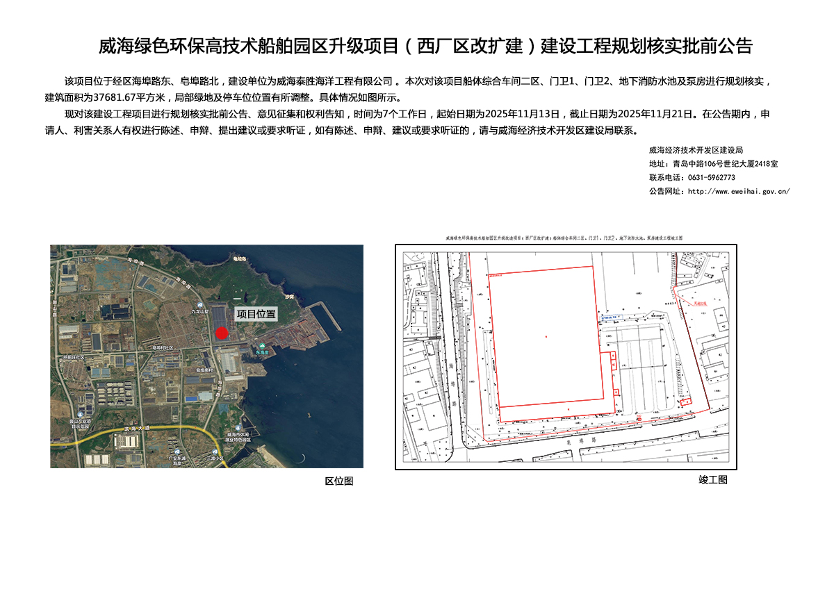 威海绿色环保高技术船舶园区升级项目(西厂区改扩建)建设工程竣工规划核实批前公告