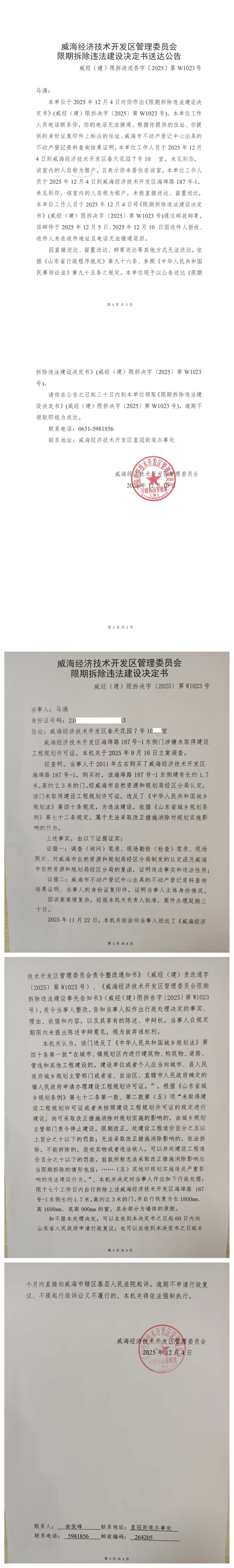 限期拆除违法建设决定书送达公告(威经(建)限拆决送告字〔2025〕第W1023号)