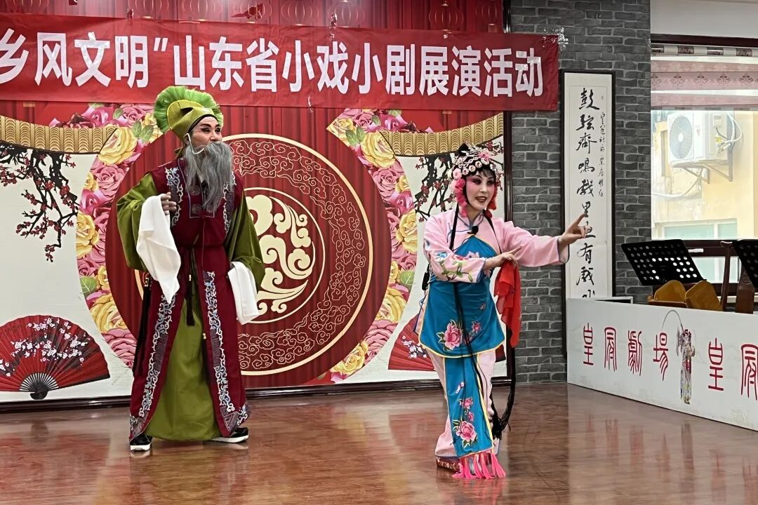 “拉大锯,扯大锯,姥姥家唱大戏……”熟悉的童年歌谣,在皇冠花园社区里有了新回响。开场大戏是吕剧经典《姊妹易嫁》选场。老戏骨们一开嗓,那醇厚地道的唱腔瞬间将观众带入情境。鞠老师饰演的张有旺憨厚朴实,杨老师反串的毛纪儒雅深情,王老师与徐老师将素花、素梅两姐妹的不同心性演绎得活灵活现。