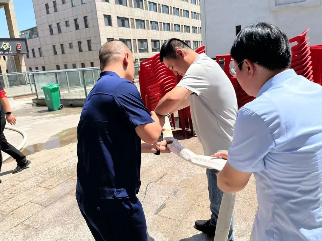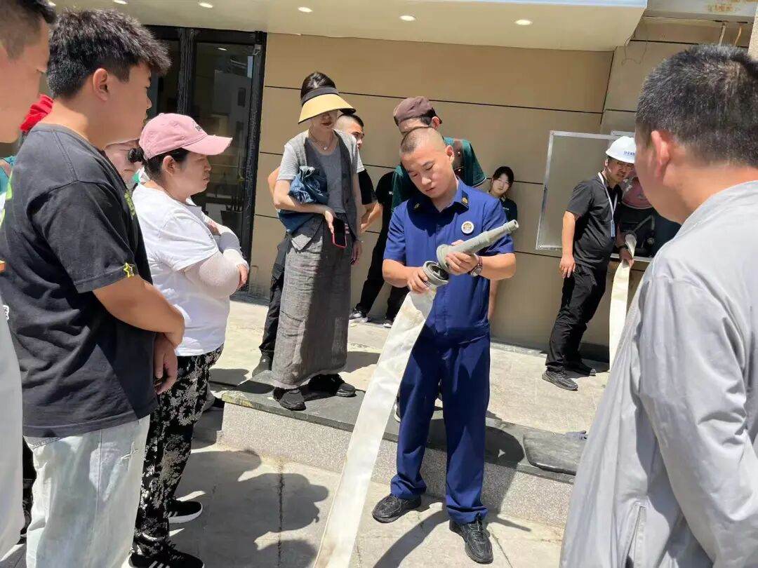 在模拟火情环节,物业安保人员与商户组成协作小组,迅速完成水带连接、水枪组装等步骤。参训人员在尝试卷盘操作时,因水压过大险些脱手,专家立即示范标准姿势:“右手握紧喷头,左手托住胶管,用腰部力量控制方向。”经过实战演练,参训人员对消防设施的使用有了更直观的认识。