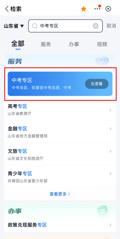 1.打开“爱山东”APP,首页搜索“中考专区”进入服务页面;