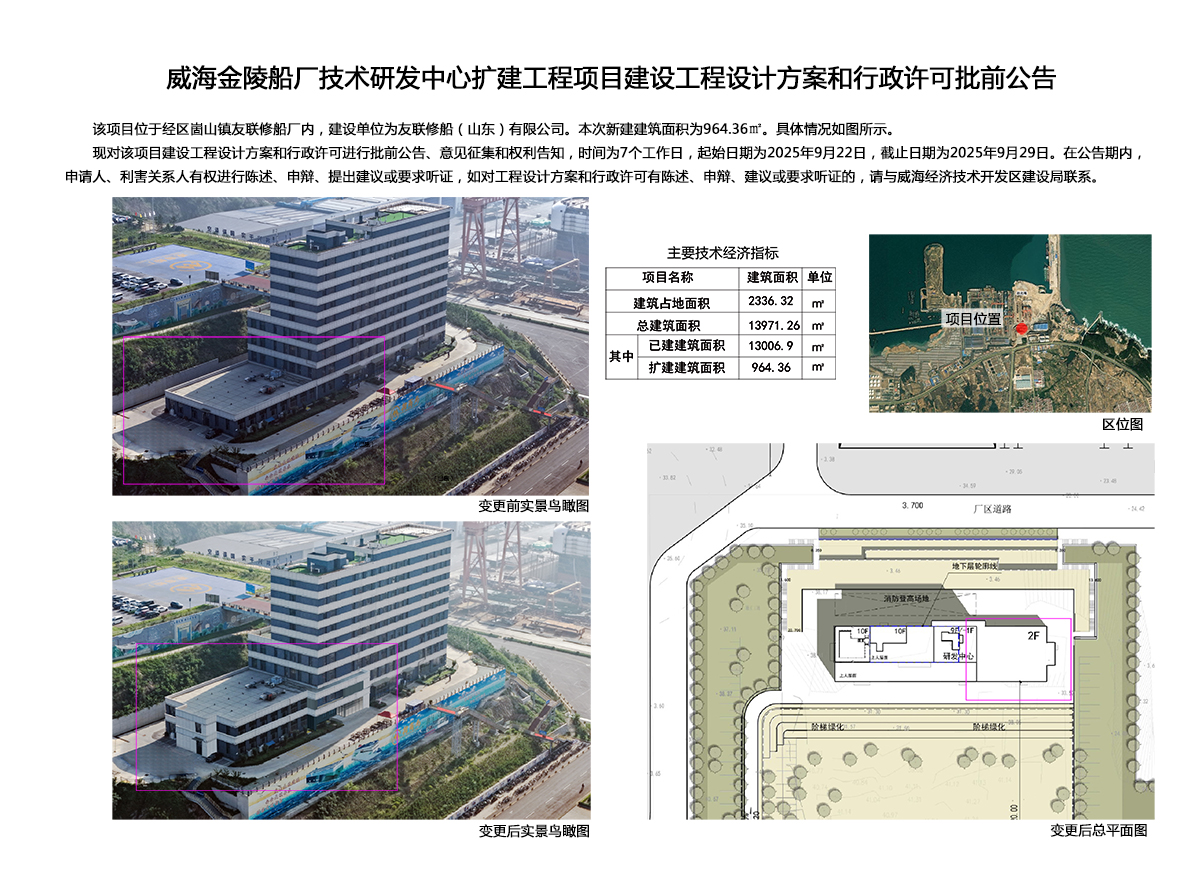 威海金陵船厂技术研发中心扩建工程项目建设工程设计方案和行政许可批前公告