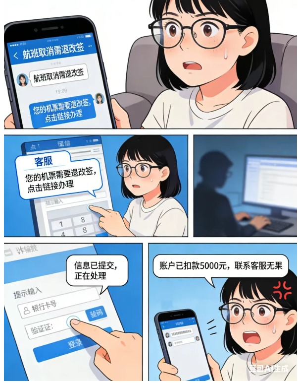 春节到来,在外的游子归乡心切,还有人在春节假期出门旅游,但是要小心诈骗分子乘虚而入。诈骗分子冒充航空公司、票务平台或机场客服,通过短信、电话或邮件通知您预定的航班因“机械故障”“天气原因”“票务问题”等被取消或改签。一个“客服电话”,一条“改签专用链接”,一步步引导你“操作退款”。